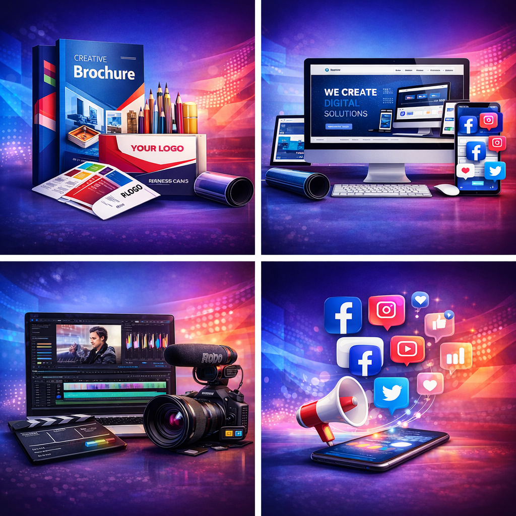 In todayโs competitive environment, businesses need both strong digital presence and effective visual branding. Our company provides a complete range of services including graphic design, print design, website development, video editing, and social media marketing.